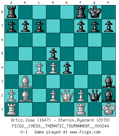 Last move : 0-1 2021 June 7 12:16:20 [Event "FICGS__CHESS__THEMATIC_TOURNAMENT__000244"] [Site "FICGS"] [Date "2021.04.19"] [Round "1"] [White "Ortiz,Jose"] [Black "Sternik,Ryszard"] [Result "0-1"] [WhiteElo "1647"] [BlackElo "2073"] 1.e4 e5 2.Bc4 Nf6 3.Nc3 Nc6 4.Nf3 Nxe4 5.O-O Nxc3 6.bxc3 e4 7.Nd4 d5 8.Bb3 Nxd4 9.cxd4 Bd6 10.Bb2 O-O 11.h3 Qg5 12.c4 Bxh3 13.g3 Bxg3 14.Qe2 Bh2+ 15.Kh1 Qg2+ 0-1 Bishop's Opening : Berlin defense Kingside Castling by player White (move 5) Kingside Castling by player Black (move 10) Player Black won this chess game. Follow this game move after move (download)The passed pawn is a criminal, who should be kept under lock and key. Mild measures, such as police surveillance, are not sufficient. (Nimzovitch) Wenn ich mich einlogge, glauben die Leute gewöhnlich nicht, dass ich es selbst bin und sie fangen an, mir dumme Fragen zu stellen. Und wenn sie es glauben, stellen sie wieder andere dumme Fragen. (Judith Polgar) Fischer es el jugador mas fuerte del mundo. De hecho, el jugador mas fuerte que jamas haya existido. (Larry Evans) La victoire dans une partie d'Echecs appartient la plupart du temps à celui qui voit un peu plus loin que l'adversaire. (Lasker) Crush them ! Make them suffer ! (General Grievous in Star Wars ep.3)