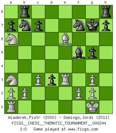 Last move : 1-0 2021 July 27 19:59:12 [Event "FICGS__CHESS__THEMATIC_TOURNAMENT__000244"] [Site "FICGS"] [Date "2021.04.19"] [Round "1"] [White "Wiaderek,Piotr"] [Black "Domingo,Jordi"] [Result "1-0"] [WhiteElo "2000"] [BlackElo "2011"] 1.e4 e5 2.Bc4 f5 3.d4 exd4 4.Nh3 Nc6 5.Ng5 Nh6 6.O-O fxe4 7.Nxe4 d5 8.Qh5+ g6 9.Qxd5 Qxd5 10.Bxd5 Bf5 11.Bg5 Bg7 12.Re1 Kf8 13.Na3 Nf7 14.Bh4 Nb4 15.Bb3 Nc6 16.Nc5 g5 17.Bg3 d3 18.c3 Be5 19.Nxb7 Rb8 20.Nc5 Bxg3 21.hxg3 Na5 22.Re3 Kg7 23.Be6 Nb7 24.Na6 1-0 Bishop's Opening : Calabrese counter-gambit Kingside Castling by player White (move 6) Player White won this chess game. Follow this game move after move (download)Mistrust is the most necessary characteristic of the Chess player. (Siegbert Tarrasch) Modernes Schach sorgt sich zuviel um Dinge wie Bauernstruktur usw. Vergessen Sie das, Schachmatt beendet das Spiel! (Nigel Short) Hay jugadores fuertes y personas amables y yo soy un jugador fuerte. (Bobby Fischer) Vous n'êtes pas toujours obligé de jouer le meilleur coup. Un coup doit être actif, entreprenant, correct et beau ! (David Bronstein) All men can see these tactics whereby I conquer, but what none can see is the strategy out of which victory is evolved. (Sun Tzu)