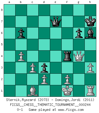 Last move : 0-1 2021 July 5 14:38:54 [Event "FICGS__CHESS__THEMATIC_TOURNAMENT__000244"] [Site "FICGS"] [Date "2021.04.19"] [Round "1"] [White "Sternik,Ryszard"] [Black "Domingo,Jordi"] [Result "0-1"] [WhiteElo "2073"] [BlackElo "2011"] 1.e4 e5 2.Bc4 f5 3.Nf3 fxe4 4.Nxe5 d5 5.Qh5+ g6 6.Nxg6 hxg6 7.Qxh8 Kf7 8.Qd4 Be6 9.Be2 Nc6 10.Qe3 Bh6 11.Qg3 Nd4 12.Bd1 Nf6 13.Na3 Nf5 14.Qb3 b6 15.c3 d4 16.Qa4 d3 17.Bb3 Bxb3 18.axb3 Nh4 19.Kf1 Qe7 20.h3 Kg7 21.g3 Nf3 22.Qc6 Rf8 23.Nb5 Qf7 24.Rxa7 Kh8 25.Nd6 Qxb3 26.Qxc7 Qd1+ 27.Kg2 Nh4+ 28.gxh4 Qf3+ 29.Kg1 Nd7 30.Nf7+ Qxf7 31.Qg3 Qf5 32.Rxd7 Qxd7 33.Qe5+ Kh7 34.Qxe4 Rf4 35.Qg2 Qe7 36.b4 Rf7 37.Qf1 Qxh4 38.Qg2 Rf5 39.Kf1 Qe7 40.Qg4 Rf4 0-1 Bishop's Opening : Calabrese counter-gambit Player Black won this chess game. Follow this game move after move (download)I won't play with you anymore. You have insulted my friend. - When an opponent cursed himself for a blunder. (Miguel Najdorf) Ja, ich habe einmal eine Blitzpartie gespielt, es war in einem Zug, 1929. --im Interview 1989 (Mikhail Moiseyevich Botvinik) El Ajedrez te enseña a controlarl la excitación inicial que sientes cuando vez algo que parece bueno y te enseña a pensar objetivamente cuando te encuentras en problemas. (Stanley Kubrick) Que feriez-vous si vous étiez en train de jouer aux échecs et que la fin du monde arrive ? Je continuerais à jouer. (Saint Borromée) 98% of all statistics are made up. (Author unknown)
