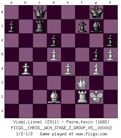 Last move : 1/2-1/2 2007 November 20 23:35:50 [Event "FICGS__CHESS__WCH_STAGE_2_GROUP_05__000002"] [Site "FICGS"] [Date "2007.07.11"] [Round "1"] [White "Vidal,Lionel"] [Black "Paine,Kevin"] [Result "1/2-1/2"] [WhiteElo "2311"] [BlackElo "1682"] 1.c4 Nf6 2.Nc3 e6 3.e4 e5 4.a3 d6 5.Nge2 Be7 6.d4 Nbd7 7.d5 O-O 8.Ng3 c6 9.Be2 cxd5 10.cxd5 Nb6 11.O-O Bd7 12.a4 Qc7 13.Nb5 Bxb5 14.Bxb5 Rfc8 15.Nf5 g6 16.Nh6+ Kg7 17.Qf3 Qc2 18.Bd3 Qb3 19.g4 Rf8 20.Ra3 Qb4 21.Bb1 Ng8 22.Qh3 Rac8 23.Nxg8 Kxg8 24.a5 Nc4 25.Rb3 Qxa5 26.Rxb7 Rfe8 27.Bd3 Qd8 28.Rb4 Nb6 29.Bb5 Nd7 30.Bc6 Rc7 31.f4 exf4 32.Bxf4 Bf8 33.Qe3 Qe7 34.Ra4 Bg7 35.Bg5 Qe5 36.Rf2 Rec8 37.h4 Nb8 38.Bb5 Nd7 39.Qf3 Rf8 40.Bxd7 Rxd7 41.Rc4 Rb7 42.Qa3 Rb6 43.b4 h6 44.Bd2 Qe7 45.Qg3 Qd7 46.Kg2 Rc8 47.Rxc8+ Qxc8 48.Qf3 Rb7 49.h5 g5 50.Re2 Rc7 51.Rf2 1/2-1/2 English : Mikenas-Carls variation Kingside Castling by player Black (move 7) Kingside Castling by player White (move 11) This chess game ended in a draw. Follow this game move after move (download)Chess is thirty to forty percent psychology. You don't have this when you play a computer. I can't confuse it. (Judith Polgar) Das Schachspiel ist ein See, in welchem eine Mücke baden und ein Elefant ertrinken kann. (Emanuel Lasker) Solo los afeminados hacen el Enroque. (Rob Sillars) Pour moi, les échecs ne sont pas un jeu mais un art. (Alexandre Alekhine) Good decisions come from experience, and experience comes from bad decisions. (Anonymous)