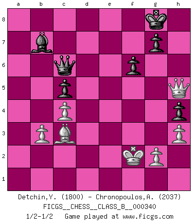 Last move : 1/2-1/2 2021 July 7 20:10:42 [Event "FICGS__CHESS__CLASS_B__000340"] [Site "FICGS"] [Date "2021.04.26"] [Round "1"] [White "Detchin,Yra"] [Black "Chronopoulos,Antonis"] [Result "1/2-1/2"] [WhiteElo "1800"] [BlackElo "2037"] 1.e4 c5 2.f4 e6 3.Nf3 d5 4.Bb5+ Nd7 5.Nc3 dxe4 6.Nxe4 Be7 7.O-O Ngf6 8.d3 a6 9.Bxd7+ Qxd7 10.Ne5 Qc7 11.a4 b6 12.b3 O-O 13.Nxf6+ Bxf6 14.Bb2 Bb7 15.Qg4 b5 16.Rf2 h6 17.h3 Kh7 18.Kh2 Rfd8 19.Qg3 Rab8 20.Qe3 Rf8 21.axb5 axb5 22.Ra7 Kg8 23.c4 bxc4 24.dxc4 Ra8 25.Rxa8 Rxa8 26.Nd3 Be7 27.Re2 Ra6 28.Ne5 Bd6 29.Kg1 h5 30.Qg3 f6 31.Ng6 Qf7 32.Qd3 Bc7 33.Qc2 Ba5 34.f5 Rd6 35.fxe6 Rxe6 36.Nf4 Rd6 37.Qf5 Rd1+ 38.Kf2 h4 39.Ng6 Rd2 40.Rxd2 Bxd2 41.Nf4 Bxf4 42.Qxf4 Qd7 43.Bc3 Qc6 44.Qg4 Kf7 45.Qh5+ Kf8 46.Qh8+ Kf7 47.Qh5+ Kg8 1/2-1/2 Comment by player 1 : Yra Detchin : I suggest a draw 0.5-0.5 Sicilian : Grand Prix attack Kingside Castling by player White (move 7) Kingside Castling by player Black (move 12) This chess game ended in a draw. Follow this game move after move (download)Avoid the crowd. Do your own thinking independently. Be the Chess player, not the Chess piece. (Ralph Charell) Schach ist mein Leben, meine Leidenschaft, was ich gelernt habe und seit meinem 14. Lebensjahr profimässig praktiziere. Darauf zu verzichten, würde mir sehr schwer fallen. (Viktor Kortschnoi) El Ajedrez es una hermosa aventura. (Bent Larsen) Des points faibles ou des trous dans la position de l'adversaire doivent être occupés par des pièces et non pas par des pions. (Siegbert Tarrasch) The difference between stupidity and genius is that genius has its limits. (Murphy)