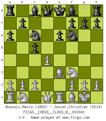 Last move : 1-0 2021 June 9 12:17:33 [Event "FICGS__CHESS__CLASS_B__000340"] [Site "FICGS"] [Date "2021.04.26"] [Round "1"] [White "Bussoli,Marco"] [Black "Javier,Christian"] [Result "1-0"] [WhiteElo "1800"] [BlackElo "2014"] 1.e4 c5 2.Nf3 Nc6 3.Bb5 e6 4.O-O Nge7 5.Re1 a6 6.Bf1 d5 7.exd5 Nxd5 8.d4 Nf6 9.Be3 1-0 This chess game has been lost on time (started : 2021.04.26 17:8:26) Sicilian : Nimzovich-Rossolimo attack (without ...d6) Kingside Castling by player White (move 4) Player White won this chess game. Follow this game move after move (download)Chess opens and enriches your mind. (Saudin Robovic) Der Verteidiger gebe der Gewalt nach, aber nur der Gewalt. Er schaffe sich nicht freiwillig, etwa aus Blindheit oder aus Schrecken, irgendwelche Schwächen. Er lasse sich nicht bluffen. (Emanuel Lasker) El juego del Ajedrez no es solamente una diversión quieta; algunas cualidades muy valuables de la mente se pueden adquirir y cultivar con el, como convertirlos en habitos disponibles para toda ocasión; ya que la vida es algo así como el Ajedrez. (Benjamin Franklin) C'est une question de caractère, Beaucoup de gens perdent leur motivation très vite. D'autres, ils sont rares, peuvent la conserver très longtemps. J'aime les échecs, encore aujourd'hui je suis heureux d'analyser des parties. J'aime toujours gagner, je déteste encore perdre. Bien jouer est important pour mon intégrité intellectuelle et morale. Et puis les échecs vivent en ce moment une période historique grâce à Internet. Ils se développent dans les systèmes éducatifs à travers le monde. Ils sortent de leur ghetto, et c'est mon rôle de mener à bien cette révolution. (Gary Kasparov) The next best thing to gambling and winning is gambling and loosing. (Nick Dandalos)