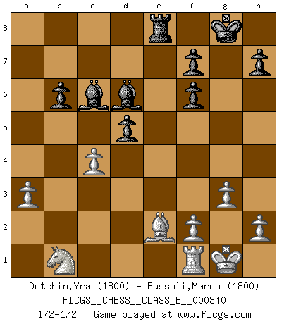 Last move : 1/2-1/2 2021 July 14 20:16:26 [Event "FICGS__CHESS__CLASS_B__000340"] [Site "FICGS"] [Date "2021.04.26"] [Round "1"] [White "Detchin,Yra"] [Black "Bussoli,Marco"] [Result "1/2-1/2"] [WhiteElo "1800"] [BlackElo "1800"] 1.e4 e5 2.Nf3 Nc6 3.d4 exd4 4.Nxd4 Nf6 5.Nxc6 bxc6 6.e5 Qe7 7.Qe2 Nd5 8.c4 Ba6 9.b3 Qh4 10.a3 Bc5 11.Ra2 O-O 12.Qf3 Nb6 13.Bd3 Rae8 14.Re2 d5 15.exd6 cxd6 16.O-O d5 17.b4 Bd6 18.g3 Qf6 19.Qxf6 gxf6 20.b5 Rxe2 21.Bxe2 Re8 22.Be3 Bb7 23.Bxb6 axb6 24.bxc6 Bxc6 1/2-1/2 Scotch : Mieses variation Kingside Castling by player Black (move 11) Kingside Castling by player White (move 16) This chess game ended in a draw. Follow this game move after move (download)Blessed be the memory of him who gave the world this immortal game. (A. G. Gardiner) Smyslow ist ein Beweis dafür, dass ich noch zehn Jahre spielen kann! [der 75 jährige über den 85 jährigen] (Viktor Kortschnoi) El juego de Fischer siempre fue nítido, racional y brillante. Uno de los mejores por siempre. (Dave Regis) Shah mat. Le roi est mort. Cri de fierté d'un joueur venant de terrasser son adversaire, courtoisement, sans effusion de sang. Looking at the proliferation of personal web pages on the Net, it looks like very soon everyone on Earth will have 15 megabytes of fame. (M.G. Sriram)