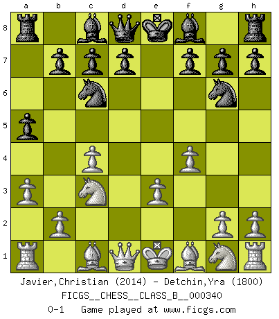 Last move : 0-1 2021 July 13 0:32:17 [Event "FICGS__CHESS__CLASS_B__000340"] [Site "FICGS"] [Date "2021.04.26"] [Round "1"] [White "Javier,Christian"] [Black "Detchin,Yra"] [Result "0-1"] [WhiteElo "2014"] [BlackElo "1800"] 1.d4 Nf6 2.c4 e5 3.dxe5 Ng4 4.Nc3 Nc6 5.e3 Ngxe5 6.f4 Ng6 7.a3 a5 0-1 This chess game has been lost on time (started : 2021.04.26 17:8:26) Budapest defense Player Black won this chess game. Follow this game move after move (download)The combination player thinks forward; he starts from the given position, and tries the forceful moves in his mind. (Emanuel Lasker) Ich las kürzlich ein Buch von Nietzsche. Er sagte Religion verdumme nur die Menschen. Ich stimme zu. (Robert James Fischer) El Ajedrez es una hermosa aventura. (Bent Larsen) Tous ces prétendus hommes politiques sont les pions, les Cavaliers, les Tours ou les Fous d'une partie d'échecs qui se jouera tant qu'un hasard ne renversera pas l'échiquier. (Honoré de Balzac) If you don't practice you don't deserve to win. (Andre Agassi)