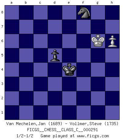 Last move : 1/2-1/2 2021 July 26 13:15:48 [Event "FICGS__CHESS__CLASS_C__000291"] [Site "FICGS"] [Date "2021.04.26"] [Round "1"] [White "Van Mechelen,Jan"] [Black "Vollmer,Steve"] [Result "1/2-1/2"] [WhiteElo "1689"] [BlackElo "1735"] 1.e4 e5 2.Nf3 Nc6 3.Bc4 Bc5 4.c3 Nf6 5.d3 O-O 6.Bg5 d6 7.Nbd2 a5 8.h3 Qe7 9.Nf1 Be6 10.Ng3 Bxc4 11.dxc4 Qe6 12.Bxf6 Qxf6 13.O-O g6 14.Qe2 Qg7 15.Rfd1 f5 16.Nf1 h6 17.Ne3 Bxe3 18.Qxe3 f4 19.Qd3 g5 20.c5 Rfd8 21.cxd6 Rxd6 22.Qc4+ Qf7 23.Qxf7+ Kxf7 24.Rxd6 cxd6 25.Rd1 Ke6 26.Rd5 Kd7 27.a4 Ra6 28.Rb5 Kc7 29.Nh2 Na7 30.Rb3 Rb6 31.Rxb6 Kxb6 32.Ng4 h5 33.Nf6 Kc5 34.b3 b5 35.axb5 Nxb5 36.b4+ axb4 37.cxb4+ Kxb4 38.Nxh5 Kc4 39.g3 Kd3 40.Nf6 Nc3 41.h4 gxh4 42.gxh4 Nxe4 43.Ng4 Ke2 44.h5 Ng5 45.h6 Nh7 46.Kg2 e4 47.Kh3 e3 48.fxe3 fxe3 49.Kh4 Kf3 50.Nxe3 Kxe3 51.Kh5 Nf8 52.Kg5 Ke4 53.Kf6 d5 54.Kf7 Nh7 55.Kg6 Nf8+ 1/2-1/2 Giuoco Piano Kingside Castling by player Black (move 5) Kingside Castling by player White (move 13) 10 pieces endgame at move 42 : White KNPPP , Black KNPPP WHITE : King + 1 Knight 3 Pawns BLACK : King + 1 Knight 3 Pawns 9 pieces endgame at move 42 : White KNPP , Black KNPPP WHITE : King + 1 Knight 2 Pawns BLACK : King + 1 Knight 3 Pawns 8 pieces endgame at move 48 : White KNPP , Black KNPP WHITE : King + 1 Knight 2 Pawns BLACK : King + 1 Knight 2 Pawns 7 pieces endgame at move 48 : White KNP , Black KNPP WHITE : King + 1 Knight 1 Pawn BLACK : King + 1 Knight 2 Pawns 6 pieces endgame at move 50 : White KNP , Black KNP WHITE : King + 1 Knight 1 Pawn BLACK : King + 1 Knight 1 Pawn 5 pieces endgame at move 50 : White KP , Black KNP WHITE : King + 1 Pawn BLACK : King + 1 Knight 1 Pawn This chess game ended in a draw. Follow this game move after move (download)The sign of a great Master is his ability to win a won game quickly and painlessly. (Irving Chernev) Ein Schachgenie ist jemand der verdammt gut Schach spielt. (Jonathan Levitt) ¿Se han dado cuenta de que Fischer casi nunca ha tenido piezas malas? El las intercambia y las piezas malas se quedan con sus oponenets. (Yuri Balashov) Le pion, dans sa simplicité, marche droit devant lui, mais lorsqu'il prend, il le fait obliquement? Ainsi l'homme, tant qu'il reste pauvre, marche dans la droiture et vit honnêtement, mais lorsqu'il recherche les honneurs, il flatte, se parjure et, par les voies obliques, cherche une position supérieure sur l'échiquier du monde. (Jean de Galles) I'm extremely disappointed. I send you out for exciting, new designer drugs, you come back with tomato sauce. (Gregory House, House M.D.)