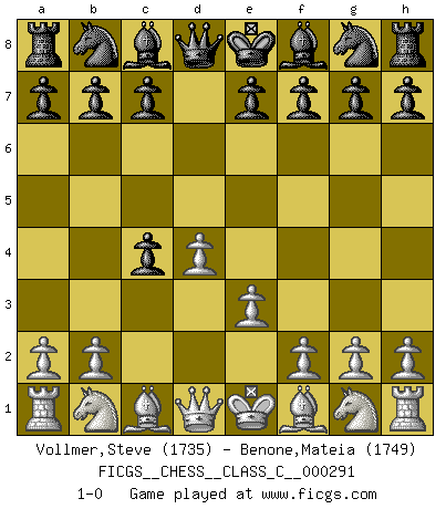 Last move : 1-0 2021 June 6 5:48:14 [Event "FICGS__CHESS__CLASS_C__000291"] [Site "FICGS"] [Date "2021.04.26"] [Round "1"] [White "Vollmer,Steve"] [Black "Benone,Mateia"] [Result "1-0"] [WhiteElo "1735"] [BlackElo "1749"] 1.d4 d5 2.c4 dxc4 3.e3 1-0 This chess game has been lost on time (started : 2021.04.26 17:10:5) Queen's gambit accepted Player White won this chess game. Follow this game move after move (download)Modern Chess is too much concerned with things like Pawn structure. Forget it, Checkmate ends the game. (Nigel Short) Man gibt nur Pakete auf. (Paul Keres) No es una movida, aún la mejor movida que tu debas buscar, sino un plan comprensible. (Eugene Znosko-Borovsky) Le génie consiste à savoir transgresser les règles au moment opportun. (Teichmann) Luck never gives; it only lends. (Swedish proverb)