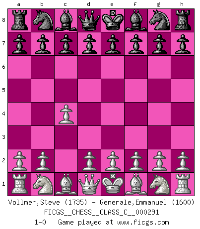 Last move : 1-0 2021 June 6 5:48:14 [Event "FICGS__CHESS__CLASS_C__000291"] [Site "FICGS"] [Date "2021.04.26"] [Round "1"] [White "Vollmer,Steve"] [Black "Generale,Emmanuel"] [Result "1-0"] [WhiteElo "1735"] [BlackElo "1600"] 1.c4 1-0 This chess game has been lost on time (started : 2021.04.26 17:10:5) English Opening Player White won this chess game. Follow this game move after move (download)Why must I lose to this idiot ? (Aron Nimzovich) Es gibt zwei Arten von Opfern: Korrekte und meine. (Mikhail Nekhemyevich Tal) El jugador táctico debe saber que hacer cuando algo se debe de hacer. El estratégico debe saber que hacer cuando nada se debe de hacer. (Savielly Tartakover) Psychologiquement, tu dois avoir confiance en toi même, mais cette confiance doit être basée sur des faits. (Robert Fischer) A person who never made a mistake never tried anything new. (Albert Einstein)