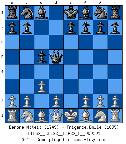 Last move : 0-1 2021 June 9 12:17:33 [Event "FICGS__CHESS__CLASS_C__000291"] [Site "FICGS"] [Date "2021.04.26"] [Round "1"] [White "Benone,Mateia"] [Black "Trigance,Emile"] [Result "0-1"] [WhiteElo "1749"] [BlackElo "1695"] 1.e4 c5 2.c3 d5 3.exd5 Qxd5 0-1 This chess game has been lost on time (started : 2021.04.26 17:10:5) Sicilian : Alapin's variation (2.c3) Player Black won this chess game. Follow this game move after move (download)No Chess Grandmaster is normal; they only differ in the extent of their madness. (Viktor Korchnoi) Ein Gewinn durch eine ungenaue Kombination, sei sie auch noch so vorzeigbar, erfüllt mich mit Schaudern. (Wilhelm Steinitz) Bobby Fischer es el jugador de Ajedrez mas grande que jamás haya existido. (Ken Smith) On croit qu'il y a plus de mauvais joueurs que de bons joueurs, c'est faux : Il y a autant de joueurs qui gagnent que de joueurs qui perdent. (Philippe Geluck) When you've done things right people won't know you've done anything at all. (Futurama)