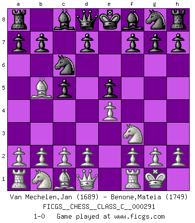 Last move : 1-0 2021 June 8 11:36:53 [Event "FICGS__CHESS__CLASS_C__000291"] [Site "FICGS"] [Date "2021.04.26"] [Round "1"] [White "Van Mechelen,Jan"] [Black "Benone,Mateia"] [Result "1-0"] [WhiteElo "1689"] [BlackElo "1749"] 1.e4 c5 2.Nf3 Nc6 3.Bb5 e5 4.O-O 1-0 This chess game has been lost on time (started : 2021.04.26 17:10:5) Sicilian : Nimzovich-Rossolimo attack (without ...d6) Kingside Castling by player White (move 4) Player White won this chess game. Follow this game move after move (download)When you are lonely, when you feel yourself an alien in the world, play Chess. This will raise your spirits and be your counselor in war. (Aristotle) Sie führen leise Selbstgespräche, schlürfen lautstark ihre Getränke, schmatzen hörbar beim Essen, blasen ihrem Gegenüber Rauch in die Augen, niesen ihm ins Gesicht, starren ihn unverwandt an, bis er sich unter ihren Blicken windet, rutschen ständig auf ihrem Stuhl hin und her, rülpsen und bohren in der Nase. (Anonymous) La belleza de un movimiento no se refleja solo en su apariencia, sino en el pensamiento detrás de él. (Siegbert Tarrasch) Je ne suis pas le dernier à jouer lâchement des coups douteux pendant le zeïtnot de l'adversaire pour l'achever: en effet les coups qui font le plus peur sont ceux que l'on ne comprend pas. Je me fais souvent peur quand je joue. (Un professeur anonyme) As the days dwindle down... to a precious few. (Maxwell Anderson)