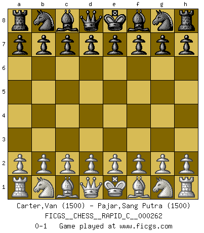 Last move : 0-1 2021 May 26 19:38:17 [Event "FICGS__CHESS__RAPID_C__000262"] [Site "FICGS"] [Date "2021.04.26"] [Round "1"] [White "Carter,Van"] [Black "Pajar,Sang Putra"] [Result "0-1"] [WhiteElo "1500"] [BlackElo "1500"] 0-1 This chess game has been lost on time (started : 2021.04.26 17:10:24) Player Black won this chess game. Follow this game move after move (download)A sacrifice is best refuted by accepting it. (Wilhelm Steinitz) Es macht mich traurig, wenn ich sehe, dass Golfprofis mehr verdienen als Schachsportler. Obwohl ich davon überzeugt bin, dass wir Schachspieler viel härter trainieren müssen als die Golfer. (Alexandra Kosteniuk) Coloca el contenido del tablero de Ajedrez en un sombrero, agita las piezas vigorosamente, derrámalas en el tablero desde una altura de medio metro y así obtienes el estilo de Wilhelm Steinitz. (H. E. Bird) D'abord les bases : Jouez et étudiez, puis étudiez et jouez, ensuite jouez et étudiez, puis étudiez et jouez. Deuxièmement : Donnez toujours le meilleur de vous-même ! (Ken Smith) Home computers are being called upon to perform many new functions, including the consumption of homework formerly eaten by the dog. (Doug Larson)