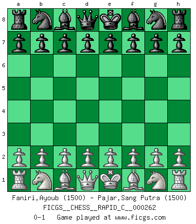 Last move : 0-1 2021 May 26 19:38:17 [Event "FICGS__CHESS__RAPID_C__000262"] [Site "FICGS"] [Date "2021.04.26"] [Round "1"] [White "Faniri,Ayoub"] [Black "Pajar,Sang Putra"] [Result "0-1"] [WhiteElo "1500"] [BlackElo "1500"] 0-1 This chess game has been lost on time (started : 2021.04.26 17:10:24) Player Black won this chess game. Follow this game move after move (download)Examine moves that smite! A good eye for smites is far more important than a knowledge of strategical principles. (Purdy) In Buenos Aires ist es nicht mein vorrangiges Ziel ein starkes Turnier zu organisieren, sondern ein Turnier für Gentlemen. Ich würde nie Kamsky einladen. Ich mag keine Probleme. (Miguel Najdorf) Cada Peón es potencialmente una Reina. (James Mason) Les échecs, c'est la lutte contre l'erreur. (Johannes Zukertort) Thibault, I ask for draw. Game 13876. - Sorry Ilmars, you won. (FICGS chat)