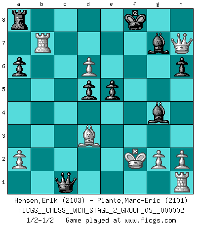 Last move : 1/2-1/2 2007 July 31 8:21:54 [Event "FICGS__CHESS__WCH_STAGE_2_GROUP_05__000002"] [Site "FICGS"] [Date "2007.07.11"] [Round "1"] [White "Hensen,Erik"] [Black "Plante,Marc-Eric"] [Result "1/2-1/2"] [WhiteElo "2103"] [BlackElo "2101"] 1.e4 c5 2.Nf3 d6 3.d4 cxd4 4.Nxd4 Nf6 5.Nc3 a6 6.Bg5 e6 7.f4 Nc6 8.Nxc6 bxc6 9.e5 h6 10.Bh4 g5 11.fxg5 Nd5 12.Nxd5 cxd5 13.Qh5 Qb6 14.Bd3 Bg7 15.g6 O-O 16.exd6 Qb4+ 17.c3 Bxc3+ 18.Kd1 Qxb2 19.gxf7+ Rxf7 20.Qg6+ Bg7 21.Rb1 Qd4 22.Qh7+ Kf8 23.Be7+ Ke8 24.Qg8+ Rf8 25.Qh7 e5 26.Bxf8 Bg4+ 27.Ke1 Qe3+ 28.Kf1 Kxf8 29.Rb7 Qc1+ 30.Kf2 Qf4+ 31.Ke1 Qc1+ 32.Kf2 Qf4+ 33.Ke1 Qc1+ 34.Kf2 1/2-1/2 Sicilian : Najdorf, 7.f4 Kingside Castling by player Black (move 15) This chess game ended in a draw. Follow this game move after move (download)A strong memory, concentration, imagination, and a strong will is required to become a great Chess player. (Bobby Fischer) Früher wurde jeder komplizierte Zug, jedes interessante Opfer mit großem Beifall und Enthusiasmus aufgenommen. Heute schaltet man einfach seinen Fritz an, und man kann sehen, was los ist, ob der Zug geht oder nicht. (Vladimir Kramnik) El muchacho (en ese entonces un niño de 12 años llamado Anatoly Karpov) no tiene ni idea de lo que es el Ajedrez y no hay futuro en absoluto para el en esta profesión. (Mikhail Botvinnik) Plusieurs personnes se sont demandées comment Tal faisait pour gagner... En fait, c'est très simple ! Il met ses pièces au centre de l'échiquier et les sacrifie quelque part ! (David Bronstein) The existence of forgetting has never been proved: We only know that some things don't come to mind when we want them. (Friedrich Nietzsche)