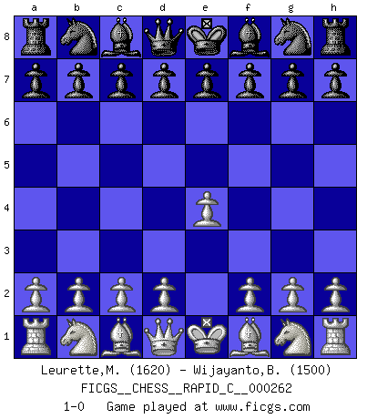 Last move : 1-0 2021 May 27 11:0:57 [Event "FICGS__CHESS__RAPID_C__000262"] [Site "FICGS"] [Date "2021.04.26"] [Round "1"] [White "Leurette,Marc-Antoine"] [Black "Wijayanto,Bayu"] [Result "1-0"] [WhiteElo "1620"] [BlackElo "1500"] 1.e4 1-0 This chess game has been lost on time (started : 2021.04.26 17:10:24) King's pawn Opening Player White won this chess game. Follow this game move after move (download)No one ever won a game by resigning. (Unknown) Ich verstehe den Grund nicht, warum die Aufteilung in Frauen und Männer überhaupt im Schach besteht. (Judith Polgar) Un Peón pasado es un criminal, quién debe ser mantenido bajo candado y llave. Leves medidas, tales como vigilancia policiaca, no son suficientes. (Aaron Nimzovich) Ce qui caractérise les parties de combat, c'est que si le défenseur a constamment de difficiles problèmes à résoudre, l'attaquant doit chercher sans relâche de nouvelles possibilités d'attaque. (Koblentz) There is no vagueness without wind. (Chinese proverb)