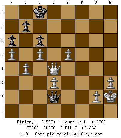 Last move : 1-0 2021 May 31 13:0:51 [Event "FICGS__CHESS__RAPID_C__000262"] [Site "FICGS"] [Date "2021.04.26"] [Round "1"] [White "Pintor,Manuel"] [Black "Leurette,Marc-Antoine"] [Result "1-0"] [WhiteElo "1573"] [BlackElo "1620"] 1.e4 e5 2.f4 d6 3.Nf3 Nc6 4.Bc4 Bg4 5.O-O Bxf3 6.Qxf3 Nf6 7.c3 Qd7 8.f5 Be7 9.d3 O-O-O 10.Bxf7 Kb8 11.Nd2 Rdf8 12.Be6 Qe8 13.Nb3 Nd8 14.Bc4 h5 15.h3 h4 16.Be3 Nc6 17.a4 g6 18.a5 a6 19.Qe2 gxf5 20.Rxf5 Ng8 21.Raf1 Rxf5 22.Rxf5 Nh6 23.Bxh6 Rxh6 24.Qf3 Rh8 25.Rf7 Nd8 26.Rg7 Rf8 27.Qg4 Bf6 28.Rh7 Rh8 29.Rxh8 Qxh8 30.Nd2 Qh6 31.Qe2 Bg5 32.Nf3 Bf4 33.b4 Ne6 34.Bxe6 Qxe6 35.Nxh4 Bg3 36.Nf5 Bf4 37.c4 c6 38.Qh5 Kc7 39.Qh7+ Kb8 40.Qh8+ Kc7 41.Qg7+ Kb8 42.Qf8+ Kc7 43.Ng7 Qc8 44.Ne8+ Kd7 45.Qf7+ Kd8 46.Nxd6 Qd7 47.Qf8+ Kc7 48.c5 Qd8 49.Qf5 Qd7 50.Qg6 Be3+ 51.Kf1 Bd4 52.Qg8 Qd8 53.Qf7+ Qd7 54.Qb3 Qh7 55.Nf5 Qh5 56.Nxd4 exd4 57.Kf2 Qh6 58.Qf7+ Kc8 59.Qe8+ Kc7 60.Qe5+ Kc8 61.Qxd4 Qd2+ 62.Kf3 Qd1+ 63.Kg3 Qe1+ 64.Kh2 Qd2 65.e5 1-0 King's gambit Kingside Castling by player White (move 5) Queenside Castling by player Black (move 9) Player White won this chess game. Follow this game move after move (download)Who is your opponent tonight, tonight I am playing against the Black pieces. (Akiba Rubinstein) Zu meiner Zeit war ein 20 jähriger ein junger Spieler, heute ist er ein Veteran. (Garry Kasparov) Aquel que ve no otra dirección en el juego que la de dar Jaque Mate a su oponente, nunca será un buen jugador de Ajedrez. (Euwe) Je menace de comprendre la position. (Anonyme) Nothing is more important for teaching us to understand the concepts we have than constructing fictitious ones. (Ludwig Wittgenstein)