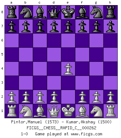 Last move : 1-0 2021 May 27 23:56:57 [Event "FICGS__CHESS__RAPID_C__000262"] [Site "FICGS"] [Date "2021.04.26"] [Round "1"] [White "Pintor,Manuel"] [Black "Kumar,Akshay"] [Result "1-0"] [WhiteElo "1573"] [BlackElo "1500"] 1.e4 1-0 This chess game has been lost on time (started : 2021.04.26 17:10:24) King's pawn Opening Player White won this chess game. Follow this game move after move (download)By this measure (on the gap between Fischer & his contemporaries), I consider him the greatest world champion. (Garry Kasparov) Der vorletzte Fehler gewinnt. (Savielly Grigorievitsch Tartakower) En la perfecta combinación de Ajedrez como en una historia corta de primera clase, toda la trama y contra trama deberá conducir hacia un final sorprendente, el interes no es mitigado hasta el último momento. (Yates and Winter) On a dit que l'homme se distingue de l'animal par le fait qu'il achète plus de livres qu'il ne peut en lire. Je voudrais suggérer qu'inclure à la liste des livres quelques livres d'échecs rendrait la distinction manifeste. (Edward Lasker) Depression is just anger without enthusiasm. (Unknown)