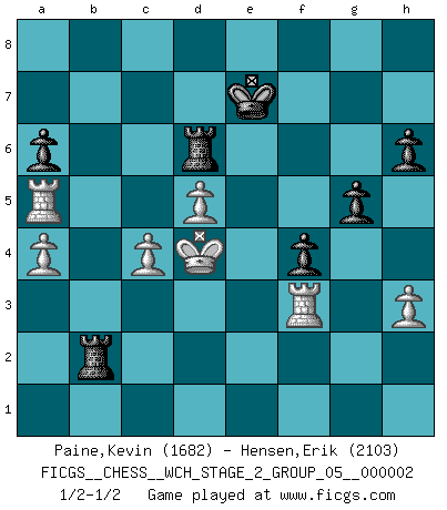 Last move : 1/2-1/2 2007 November 17 13:8:8 [Event "FICGS__CHESS__WCH_STAGE_2_GROUP_05__000002"] [Site "FICGS"] [Date "2007.07.11"] [Round "1"] [White "Paine,Kevin"] [Black "Hensen,Erik"] [Result "1/2-1/2"] [WhiteElo "1682"] [BlackElo "2103"] 1.e4 c5 2.Nf3 d6 3.Bb5+ Bd7 4.Bxd7+ Qxd7 5.O-O Nc6 6.c3 Nf6 7.d3 e6 8.h3 Be7 9.Be3 O-O 10.Nbd2 b5 11.Re1 a6 12.a4 h6 13.Kh1 Rfb8 14.Qe2 b4 15.Nc4 bxc3 16.bxc3 d5 17.exd5 Nxd5 18.Bd2 Qc7 19.Nce5 Nxe5 20.Nxe5 Bd6 21.c4 Bxe5 22.Qxe5 Qxe5 23.Rxe5 Nb4 24.Ra3 Nc2 25.Rc3 Rb1+ 26.Kh2 Nd4 27.Be3 Rc8 28.Bxd4 cxd4 29.Ra3 Rcb8 30.Kg3 R8b2 31.Kf3 g5 32.g3 Kg7 33.Ke4 Rxf2 34.Kxd4 Kf6 35.Ra5 Rb6 36.Kc5 Rfb2 37.g4 Ke7 38.d4 f5 39.gxf5 exf5 40.d5 f4 41.Kd4 Rd6 42.Rf3 Rdb6 43.Ra3 Rd6 44.Rf3 1/2-1/2 Sicilian : Canal-Sokolsky attack, 3...Bd7 Kingside Castling by player White (move 5) Kingside Castling by player Black (move 9) This chess game ended in a draw. Follow this game move after move (download)A man that will take back a move at Chess will pick a pocket. (Richard Fenton) Als ich elf wurde, wurde ich einfach gut. (Robert James Fischer) El Ajedrez lo es todo: arte, ciencia y deporte. (Anatoly Karpov) Même si vous avez un bon coup à faire, regardez toujours s'il n'y en a pas un qui lui soit préférable. (Pedro Damiano) If things go wrong, don't go with them. (Roger Babson)