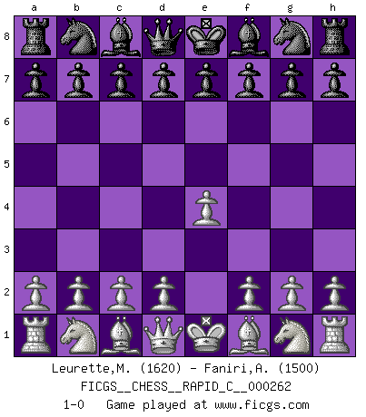 Last move : 1-0 2021 May 27 11:0:57 [Event "FICGS__CHESS__RAPID_C__000262"] [Site "FICGS"] [Date "2021.04.26"] [Round "1"] [White "Leurette,Marc-Antoine"] [Black "Faniri,Ayoub"] [Result "1-0"] [WhiteElo "1620"] [BlackElo "1500"] 1.e4 1-0 This chess game has been lost on time (started : 2021.04.26 17:10:24) King's pawn Opening Player White won this chess game. Follow this game move after move (download)Chess is a beautiful mistress. (Bent Larsen) Woher wissen wir, daß der Neanderthaler Blindschach gespielt hat? -- Bei Ausgrabungen wurden keine Schachbretter und Figuren gefunden. (Anonymous) Una buena ofensiva y una buena defensa, comienzan ambas con un buen desarrollo. (Bruce A. Moon) Si je n'étais pas joueur d'échecs, je serais le meilleur dans quelque chose d'autre. (Anatoli Karpov) You can think I'm wrong, but that's no reason to quit thinking. (Gregory House, House M.D.)