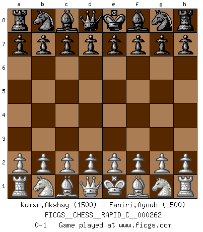 Last move : 0-1 2021 May 26 19:38:17 [Event "FICGS__CHESS__RAPID_C__000262"] [Site "FICGS"] [Date "2021.04.26"] [Round "1"] [White "Kumar,Akshay"] [Black "Faniri,Ayoub"] [Result "0-1"] [WhiteElo "1500"] [BlackElo "1500"] 0-1 This chess game has been lost on time (started : 2021.04.26 17:10:24) Player Black won this chess game. Follow this game move after move (download)The King is a fighting piece. Use it ! (Wilhelm Steinitz) Kombinieren und Schwarzhandel gehören verboten. (Savielly Grigorievitsch Tartakower) Una victoria por una combinación errónea, aunque sea espectacular, me llena de horror artístico. (Wilhelm Steinitz) La tactique est l'élément le plus important du milieu de jeu. (Siegbert Tarrasch) Perhaps the current trend of many chess professionals taking up the more lucrative pastime of poker is not a wholly negative one. It may not be too late for humans to relearn how to take risks in order to innovate and thereby maintain the advanced lifestyles we enjoy. And if it takes a poker-playing supercomputer to remind us that we can't enjoy the rewards without taking the risks, so be it. (The Chess Master and the Computer, by Garry Kasparov - 2010)