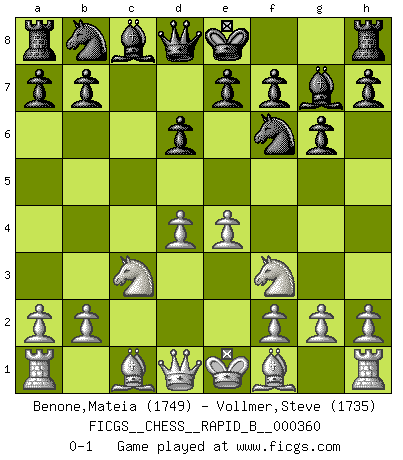 Last move : 0-1 2021 June 12 6:24:14 [Event "FICGS__CHESS__RAPID_B__000360"] [Site "FICGS"] [Date "2021.05.01"] [Round "1"] [White "Benone,Mateia"] [Black "Vollmer,Steve"] [Result "0-1"] [WhiteElo "1749"] [BlackElo "1735"] 1.e4 c5 2.c3 d6 3.d4 cxd4 4.cxd4 Nf6 5.Nc3 g6 6.Nf3 Bg7 0-1 This chess game has been lost on time (started : 2021.05.01 16:55:30) Sicilian : Alapin's variation (2.c3) Player Black won this chess game. Follow this game move after move (download)Though most people love to look at the games of the great attacking masters, some of the most successful players in history have been the quiet positional players. They slowly grind you down by taking away your space, tying up your pieces, and leaving you with virtually nothing to do ! (Yasser Seirawan) Wenn ein Kopf und ein Buch zusammenstoßen und es klingt hohl, ist es denn allemal im Buche? (Georg Christoph Lichtenberg) Un mal día en el Ajedrez, es mejor que cualquier buen día en el trabajo. (Anonymous) Votre prénom est 'Tactique', votre deuxième prénom est 'Tactique' et votre nom est 'Tactique'. (Ken Smith) Looking at the proliferation of personal web pages on the Net, it looks like very soon everyone on Earth will have 15 megabytes of fame. (M.G. Sriram)