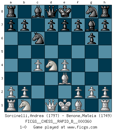 Last move : 1-0 2021 June 6 5:48:14 [Event "FICGS__CHESS__RAPID_B__000360"] [Site "FICGS"] [Date "2021.05.01"] [Round "1"] [White "Sorcinelli,Andrea"] [Black "Benone,Mateia"] [Result "1-0"] [WhiteElo "1797"] [BlackElo "1749"] 1.e4 c5 2.Nf3 Nc6 3.d4 cxd4 4.Nxd4 g6 5.c4 Bg7 6.Be3 1-0 This chess game has been lost on time (started : 2021.05.01 16:55:30) Sicilian : Accelerated Fianchetto, Maroczy bind, 6.Be3 Player White won this chess game. Follow this game move after move (download)Chess is a matter of delicate judgment, knowing when to punch and how to duck. (Bobby Fischer) Nie in meinem Leben habe ich die französische Verteidigung gespielt, welche die Stumpfsinnigste von allen ist. (Wilhelm Steinitz) Evita las multitudes. Haz independientemente tu propio razonamiento. Trata de ser el jugador de Ajedrez, no la pieza de Ajedrez. (Ralph Charell) Je menace de comprendre la position. (Anonyme) The quality of decision is like the well-timed swoop of a falcon which enables it to strike and destroy its victim. (Sun Tzu)