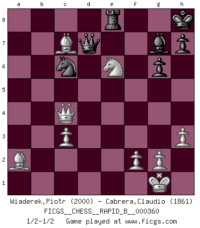 Last move : 1/2-1/2 2021 June 2 17:49:29 [Event "FICGS__CHESS__RAPID_B__000360"] [Site "FICGS"] [Date "2021.05.01"] [Round "1"] [White "Wiaderek,Piotr"] [Black "Cabrera,Claudio"] [Result "1/2-1/2"] [WhiteElo "2000"] [BlackElo "1861"] 1.e4 e5 2.Nf3 Nc6 3.Bb5 a6 4.Ba4 Nf6 5.O-O Nxe4 6.d4 b5 7.Bb3 d5 8.dxe5 Be6 9.c3 Be7 10.Nbd2 Nc5 11.Bc2 d4 12.Nb3 d3 13.Bb1 Nxb3 14.axb3 Bf5 15.Re1 Qd5 16.b4 O-O 17.h3 Qd7 18.Bf4 Kh8 19.Bg3 Rfd8 20.Re3 a5 21.bxa5 Rxa5 22.Rxa5 Nxa5 23.Nd4 Bg6 24.Rxd3 Bxd3 25.Qxd3 g6 26.Ba2 Nc6 27.e6 fxe6 28.Qe3 Bf6 29.Nxe6 Re8 30.Bxc7 b4 31.Qc5 bxc3 32.bxc3 Bg7 33.Qc4 1/2-1/2 Ruy Lopez : Open, 7.Bb3 Kingside Castling by player White (move 5) Kingside Castling by player Black (move 16) This chess game ended in a draw. Follow this game move after move (download)Chess is imagination. (David Bronstein) Wenn es im Universum noch irgendwo intelligente Lebewesen gibt, dann kennen sie Go. (Emanuel Lasker) Uno por uno, yo los acribillé, mi superioridad muy pronto se volvio aparente. (Jose Capablanca) Avant la finale, les dieux ont créé le milieu de partie. (Tarrasch) Heh, heh, heh. Time to abandon ship. (General Grievous in Star Wars ep.3)