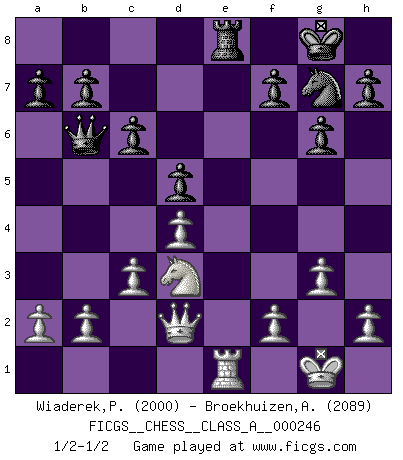 Last move : 1/2-1/2 2021 June 8 9:26:34 [Event "FICGS__CHESS__CLASS_A__000246"] [Site "FICGS"] [Date "2021.05.01"] [Round "1"] [White "Wiaderek,Piotr"] [Black "Broekhuizen,A. T. S."] [Result "1/2-1/2"] [WhiteElo "2000"] [BlackElo "2089"] 1.e4 e5 2.Nf3 Nc6 3.Bb5 Nf6 4.O-O Nxe4 5.Re1 Nd6 6.Nxe5 Be7 7.Bf1 Nxe5 8.Rxe5 O-O 9.d4 Bf6 10.Re1 Re8 11.c3 Rxe1 12.Qxe1 Ne8 13.Bf4 d5 14.Bd3 g6 15.Nd2 Ng7 16.Nf3 Bf5 17.Bxf5 Nxf5 18.Qd2 Ng7 19.Re1 c6 20.g3 Qb6 21.Bd6 Rd8 22.Be5 Bxe5 23.Nxe5 Re8 24.Nd3 1/2-1/2 Ruy Lopez : Berlin defense, Open variation Kingside Castling by player White (move 4) Kingside Castling by player Black (move 8) This chess game ended in a draw. Follow this game move after move (download)It is difficult to play against Einstein's theory --on his first loss to Fischer. (Mikhail Tal) Wenn man heute mit 14 Jahren noch kein GM ist, kann man es vergessen. (Viswanathan Anand) A través de las casillas del tablero, los Indios explican el movimiento del tiempo y la edad, las influencias mas altas que controlan el mundo y los lazos que vinculan al Ajedrez con el alma humana. (Al-Masudi) Les Echecs, c'est l'art de la guerre sans les charniers, c'est la résurrection des morts tombés au champ d'honneur, l'espoir perpétuel, la suprématie de l'intelligence sur la force, la culture de l'esprit. (F. Szpiner) You can't play chess if you're groggy from pills. (Anatoly Karpov)