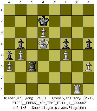 Last move : 1/2-1/2 2007 November 15 16:1:7 [Event "FICGS__CHESS__WCH_SEMI_FINAL_1__000002"] [Site "FICGS"] [Date "2007.07.11"] [Round "5"] [White "Riemer,Wolfgang"] [Black "Utesch,Wolfgang"] [Result "1/2-1/2"] [WhiteElo "2499"] [BlackElo "2535"] 1.c4 e5 2.g3 Nf6 3.Bg2 Nc6 4.Nf3 Bc5 5.O-O d6 6.Nc3 a6 7.a3 O-O 8.e3 Re8 9.d3 a5 10.b3 Bf5 11.h3 h6 12.Bb2 Bh7 13.Rc1 Bb6 14.d4 exd4 15.exd4 d5 16.cxd5 Nxd5 17.Na4 Be4 18.Re1 Nf6 19.Ne5 Bxg2 20.Nxb6 Ra6 21.Kxg2 Rxb6 22.Qf3 Qd5 23.Re3 Re6 24.Rd3 Ra6 25.Rc5 Nxe5 26.Qxd5 Nxd5 27.dxe5 c6 28.f4 f5 29.Kf2 Ra8 30.Bc1 Kf7 31.g4 b6 32.Rc2 g6 33.Kf3 h5 34.gxf5 gxf5 35.Be3 a4 36.b4 b5 37.Bf2 Rg8 38.Rd1 Reg6 39.Rdc1 Ne7 40.Rd2 Nd5 41.Bh4 Ke8 42.Re2 Re6 43.Bg5 Kd7 44.Kg3 Ke8 45.Rec2 Ne7 46.Rc3 Kf7 47.Kf2 Reg6 48.Bxe7 Kxe7 49.Rxc6 Rg2+ 50.Ke3 R2g3+ 51.Kd4 Rd8+ 52.Kc5 Rb8 53.Rd1 Rc3+ 54.Kd5 Rd8+ 55.Rd6 Rxd6+ 56.exd6+ Kd7 57.Rg1 Rd3+ 58.Kc5 Rc3+ 59.Kd5 1/2-1/2 English Opening Kingside Castling by player White (move 5) Kingside Castling by player Black (move 7) This chess game ended in a draw. Follow this game move after move (download)Discovered check is the dive bomber of the Chessboard. (Reuben Fine) Ich verlor meine Bürgerrechte, mein Gehalt wurde mir nicht mehr bezahlt und ich wurde zensiert und durfte nicht mehr ins Ausland reisen. [nach dem Match Fischer-Taimanov 6:0] (Mark Taimanov) Observen a Garry Kasparov. Después de una derrota, invariablemente el gana la próxima partida. Prácticamente hace pedazos a su siguiente oponente. Eso es algo que tenemos que aprender a lograr. (Maurice Ashley) Celui qui prend des risques peut perdre, celui qui n'en prend pas perd toujours. (Xavier Tartacover) Somewhere in the world there is an epigram for every dilemma. (Hendrik Willem van Loon)