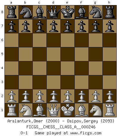 Last move : 0-1 2021 June 11 3:42:56 [Event "FICGS__CHESS__CLASS_A__000246"] [Site "FICGS"] [Date "2021.05.01"] [Round "1"] [White "Arslanturk,Omer"] [Black "Osipov,Sergey"] [Result "0-1"] [WhiteElo "2000"] [BlackElo "2093"] 0-1 This chess game has been lost on time (started : 2021.05.01 17:36:13) Player Black won this chess game. Follow this game move after move (download)A bad day of Chess is better than any good day at work. (Anonymous) Frage des Reporters: -Worin besteht das Ziel von Gambiteröffnungen? Antwort: -Auf Kosten der Partie einen Ruf als Angriffspieler zu erwerben.- (Siegbert Tarrasch) Hay jugadores fuertes y personas amables y yo soy un jugador fuerte. (Bobby Fischer) La guerre est enfant de la passion, la passion est enfant du narcissisme et le narcissisme est l'enfant. (...) Une autre partie ? (Thibault de Vassal) There is no vagueness without wind. (Chinese proverb)