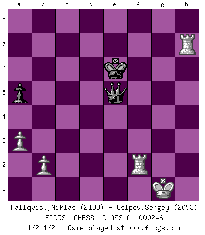 Last move : 1/2-1/2 2021 May 19 11:8:16 [Event "FICGS__CHESS__CLASS_A__000246"] [Site "FICGS"] [Date "2021.05.01"] [Round "1"] [White "Hallqvist,Niklas"] [Black "Osipov,Sergey"] [Result "1/2-1/2"] [WhiteElo "2183"] [BlackElo "2093"] 1.c4 e5 2.g3 Nf6 3.Bg2 Bc5 4.Nc3 c6 5.Nf3 e4 6.Nh4 d5 7.cxd5 cxd5 8.d3 Ng4 9.O-O g5 10.d4 Be7 11.h3 Nxf2 12.Rxf2 gxh4 13.Qb3 Be6 14.Qxb7 Qd7 15.Qxa8 O-O 16.Bh6 Rd8 17.Nxe4 Na6 18.Qxd8+ Qxd8 19.Nc3 hxg3 20.Rf3 Bd6 21.Raf1 Nb4 22.e3 a5 23.a3 Nd3 24.e4 Qh4 25.Rxd3 Qxh6 26.e5 Be7 27.Rxg3+ Kf8 28.Bxd5 Bxd5 29.Nxd5 Qh4 30.Rg4 Qxh3 31.R1f4 Qb3 32.Nxe7 Kxe7 33.Rg7 Qe3+ 34.Rf2 Qxd4 35.Rgxf7+ Ke6 36.Rxh7 Qxe5 1/2-1/2 English Opening Kingside Castling by player White (move 9) Kingside Castling by player Black (move 15) 10 pieces endgame at move 35 : White KRRPPP , Black KQPP WHITE : King + 2 Rooks 3 Pawns BLACK : King + 1 Queen 2 Pawns 9 pieces endgame at move 36 : White KRRPPP , Black KQP WHITE : King + 2 Rooks 3 Pawns BLACK : King + 1 Queen 1 Pawn 8 pieces endgame at move 36 : White KRRPP , Black KQP WHITE : King + 2 Rooks 2 Pawns BLACK : King + 1 Queen 1 Pawn This chess game ended in a draw. Follow this game move after move (download)Chess is a sea in which a gnat may drink and an elephant may bathe. (Hindu proverb) Alles was ich jemals tun will ist Schach spielen. (Robert James Fischer) Por esta medida (el intervalo entre Fischer y sus contemporaneos), yo le considero el mas grande campeón mundial. (Garry Kasparov) L'ordinateur a tué l'originalité. Il n'y a plus guère d'aventures sur l'échiquier. (Jacob Murray) Secret operations are essential in war; upon them the army relies to make its every move. (Sun Tzu)