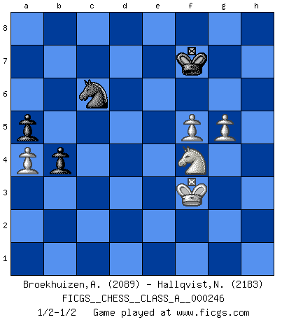 Last move : 1/2-1/2 2021 August 16 12:45:44 [Event "FICGS__CHESS__CLASS_A__000246"] [Site "FICGS"] [Date "2021.05.01"] [Round "1"] [White "Broekhuizen,A. T. S."] [Black "Hallqvist,Niklas"] [Result "1/2-1/2"] [WhiteElo "2089"] [BlackElo "2183"] 1.d4 e6 2.e4 d5 3.Nc3 Bb4 4.e5 c5 5.a3 Bxc3+ 6.bxc3 Ne7 7.Qg4 cxd4 8.Bd3 Qa5 9.Rb1 Kf8 10.Nf3 b6 11.Qf4 Qxc3+ 12.Bd2 Qc7 13.Bb4 Kg8 14.Bd6 Qd7 15.Bb5 Qd8 16.Nxd4 Bd7 17.c4 a6 18.Qh4 Nec6 19.Qxd8+ Nxd8 20.Bxd7 Nxd7 21.cxd5 h5 22.O-O Kh7 23.Nc6 exd5 24.Ne7 d4 25.Rb4 f6 26.Rxd4 Nxe5 27.Rh4 Kh6 28.f4 Nec6 29.g4 g6 30.f5 Nf7 31.Bf4+ g5 32.Rxh5+ Kg7 33.Rxh8 Rxh8 34.Nxc6 gxf4 35.Kg2 Rc8 36.Nd4 b5 37.Rxf4 Ne5 38.h4 Rc4 39.g5 Kg8 40.Ne6 fxg5 41.hxg5 Rxf4 42.Nxf4 a5 43.Nd5 Nc6 44.Kf3 b4 45.a4 Kf7 46.Nf4 1/2-1/2 Queen's pawn Kingside Castling by player White (move 22) 10 pieces endgame at move 41 : White KNPPP , Black KRNPP WHITE : King + 1 Knight 3 Pawns BLACK : King + 1 Rook 1 Knight 2 Pawns 9 pieces endgame at move 42 : White KNPPP , Black KNPP WHITE : King + 1 Knight 3 Pawns BLACK : King + 1 Knight 2 Pawns This chess game ended in a draw. Follow this game move after move (download)Kasparov : J'adoube , Ivanchuk : S'il vous plaît ! (Garry Kasparov & Vassily Ivanchuk, Linares 1997) Es hat in meinem Leben Zeiten gegeben, da ich sehr nahe daran war zu glauben, daß ich auch nicht eine einzige Schachpartie verlieren könnte. (José Raúl Capablanca) Yo adoro todas la posiciones. Denme una partida posicional difÃcil, y la jugaré. Pero posiciones totalmente ganadas, no las tolero. (Hein Donner) Dans le domaine de la peinture, de la gravure et de la sculpture, dès la première décennie de notre siècle, les artistes abandonnent la représentation de la partie d'échecs pour se concentrer sur les pièces, sur les échiquiers et sur toutes les variations auxquelles les unes et les autres peuvent donner lieu. On passe en quelque sorte d'un thème social à un thème musical (au sens de la musica médiévale, c'est-à -dire d'une notion qui inclue le rythme, l'harmonie, la construction et la déconstruction, etc.). Graphiquement et picturalement, l'échiquier apparaît comme une structure ouverte, dynamique, d'une richesse infinie, autorisant toutes les combinatoires et débouchant sur des mouvements et des rythmes de nature exponentielle. (Michel Pastoureau) Without deviation from the norm, progress is not possible. (Frank Zappa)