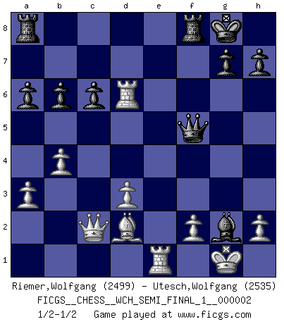 Last move : 1/2-1/2 2007 September 5 3:55:43 [Event "FICGS__CHESS__WCH_SEMI_FINAL_1__000002"] [Site "FICGS"] [Date "2007.07.11"] [Round "7"] [White "Riemer,Wolfgang"] [Black "Utesch,Wolfgang"] [Result "1/2-1/2"] [WhiteElo "2499"] [BlackElo "2535"] 1.c4 e5 2.Nc3 Nf6 3.Nf3 Nc6 4.a3 d5 5.cxd5 Nxd5 6.d3 Be7 7.e3 O-O 8.Be2 Be6 9.O-O f5 10.Qc2 a6 11.Nxd5 Bxd5 12.e4 Be6 13.exf5 Rxf5 14.Be3 Nd4 15.Nxd4 exd4 16.Bd2 Bd6 17.b4 c6 18.Rae1 Rf8 19.Bh5 Qd7 20.Re4 b6 21.Rfe1 Bd5 22.Rxd4 Qf5 23.Bf3 Bxf3 24.Rxd6 Bxg2 1/2-1/2 English Opening Kingside Castling by player Black (move 7) Kingside Castling by player White (move 9) This chess game ended in a draw. Follow this game move after move (download)I play correspondence chess because it is both art and science while chess is art only. (A player at FICGS) Es hat in meinem Leben Zeiten gegeben, da ich sehr nahe daran war zu glauben, daß ich auch nicht eine einzige Schachpartie verlieren könnte. (José Raúl Capablanca) Combinaciones deslumbrantes son para la mayoría, mover madera es para los pocos. (Georg Kieninger) Le temps de noter son nom sur la feuille de partie, j'étais déjà en zeitnot ! D'un modeste amateur apparié lors de la première ronde d'un open contre le grand-maître Azmaïparashvili. A computer lets you make more mistakes faster than any invention in human history - with the possible exceptions of handguns and tequila. (Mitch Ratcliffe)