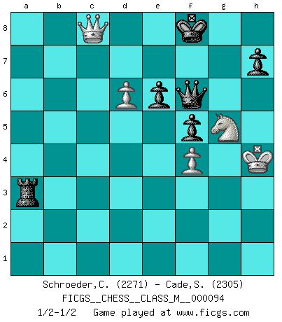 Last move : 1/2-1/2 2021 July 21 11:3:2 [Event "FICGS__CHESS__CLASS_M__000094"] [Site "FICGS"] [Date "2021.05.03"] [Round "1"] [White "Schroeder,Christoph"] [Black "Cade,Stephen"] [Result "1/2-1/2"] [WhiteElo "2271"] [BlackElo "2305"] 1.e4 c6 2.d4 d5 3.e5 c5 4.dxc5 e6 5.Be3 Nd7 6.Bb5 Ne7 7.Bd4 Nc6 8.Bxc6 bxc6 9.b4 a5 10.a3 Ba6 11.f4 g5 12.Nd2 gxf4 13.Ngf3 Rg8 14.Rg1 Be7 15.Kf2 Rg4 16.c4 Bh4+ 17.g3 fxg3+ 18.hxg3 Be7 19.Be3 dxc4 20.Qc2 f5 21.Bf4 axb4 22.axb4 Nxc5 23.bxc5 Bxc5+ 24.Kg2 Bxg1 25.Nxc4 Bc5 26.Nd6+ Bxd6 27.Qxc6+ Kf8 28.exd6 Rxf4 29.gxf4 Bb7 30.Qxb7 Rxa1 31.Ng5 Ra2+ 32.Kh3 Ra3+ 33.Kh4 Qf6 34.Qc8+ 1/2-1/2 Caro-Kann : Advance variation This chess game ended in a draw. Follow this game move after move (download)Pawns: they are the soul of this game, they alone form the attack and defense. (Philidor) Ich suche im Schach immer etwas Eigenes. Riskantes Spiel im Stile schachlicher Musketiere ist nicht meine Sache, auch wenn es vielen Freunden scharfer Wendungen gefällt. (Anatoly Karpov) ¿Que sería del Ajedrez sin errores graciosos?. (Kurt Richter) Donnez-moi un Cavalier en 6e et je gagnerais toutes mes parties. (Steinitz) Two beer, or not two beer. (Unknown)