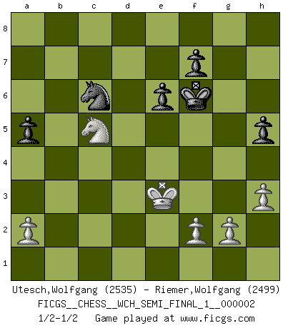 Last move : 1/2-1/2 2007 September 23 9:46:8 [Event "FICGS__CHESS__WCH_SEMI_FINAL_1__000002"] [Site "FICGS"] [Date "2007.07.11"] [Round "8"] [White "Utesch,Wolfgang"] [Black "Riemer,Wolfgang"] [Result "1/2-1/2"] [WhiteElo "2535"] [BlackElo "2499"] 1.d4 Nf6 2.c4 g6 3.Nc3 d5 4.cxd5 Nxd5 5.e4 Nxc3 6.bxc3 Bg7 7.Nf3 c5 8.Rb1 O-O 9.Be2 b6 10.O-O Bb7 11.Qd3 e6 12.Bg5 Qc7 13.Qe3 Nd7 14.e5 a6 15.Rfd1 Rfc8 16.Nd2 b5 17.Bf3 Bxf3 18.Qxf3 b4 19.Rdc1 Qa7 20.Be3 Rab8 21.Qe4 bxc3 22.Rxc3 cxd4 23.Bxd4 Rxb1+ 24.Qxb1 Qb8 25.Rxc8+ Qxc8 26.Nf3 Qc7 27.Qb2 g5 28.h3 h5 29.Nxg5 Bxe5 30.Bxe5 Qxe5 31.Qxe5 Nxe5 32.Ne4 Kg7 33.Nc5 a5 34.Kf1 Nc6 35.Ke2 Kf6 36.Ke3 1/2-1/2 King's Indian defense, 3.Nc3 Kingside Castling by player Black (move 8) Kingside Castling by player White (move 10) This chess game ended in a draw. Follow this game move after move (download)A bad plan is better than none at all. (Frank Marshall) Alles was am Schachbrett zählt sind gute Züge. (Robert James Fischer) Es muy difícil jugar en contra de la teoría de Einstein. - en su primera derrota en contra de Fischer (Mikhail Tal) C'est la seule position que je connaisse où les deux camps sont mals. Propos prêtés à V. Anand. Do not put your faith in what statistics say until you have carefully considered what they do not say. (William W. Watt)