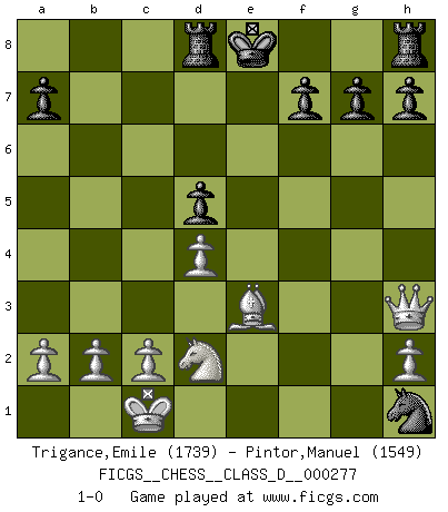 Last move : 1-0 2021 May 13 14:21:16 [Event "FICGS__CHESS__CLASS_D__000277"] [Site "FICGS"] [Date "2021.05.05"] [Round "1"] [White "Trigance,Emile"] [Black "Pintor,Manuel"] [Result "1-0"] [WhiteElo "1739"] [BlackElo "1549"] 1.e4 e5 2.f4 Bc5 3.Nf3 Nc6 4.fxe5 Nxe5 5.Nxe5 Qh4+ 6.g3 Qxe4+ 7.Qe2 Qxh1 8.d4 Be7 9.Nf3 d5 10.Be3 Bg4 11.Nbd2 Nf6 12.O-O-O Ne4 13.Bh3 Nxg3 14.Qf2 Ne4 15.Qe2 Ng3 16.Qd3 Bxh3 17.Rxh1 Nxh1 18.Qb5+ c6 19.Qxb7 Rc8 20.Ne5 Rd8 21.Nxc6 Rd7 22.Qc8+ Bd8 23.Nxd8 Rxd8 24.Qxh3 1-0 KGD : Classical variation Queenside Castling by player White (move 12) Player White won this chess game. Follow this game move after move (download)Though most people love to look at the games of the great attacking masters, some of the most successful players in history have been the quiet positional players. They slowly grind you down by taking away your space, tying up your pieces, and leaving you with virtually nothing to do ! (Yasser Seirawan) Wir irren allesamt, nur jeder irrt anders. (Georg Christoph Lichtenberg) Hay jugadores fuertes y personas amables y yo soy un jugador fuerte. (Bobby Fischer) Comme les marins qui ont mille raisons différentes d'aller en mer, les joueurs d'échecs en ont tout autant avant de s'installer devant une table et jouer... (Vincent Bertignac, philosophe) To send light into the darkness of men's hearts - such is the duty of the artist. (Schumann)