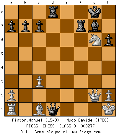 Last move : 0-1 2021 May 25 13:38:55 [Event "FICGS__CHESS__CLASS_D__000277"] [Site "FICGS"] [Date "2021.05.05"] [Round "1"] [White "Pintor,Manuel"] [Black "Nudo,Davide"] [Result "0-1"] [WhiteElo "1549"] [BlackElo "1788"] 1.e4 e5 2.f4 exf4 3.Nf3 d6 4.d4 g5 5.Bc4 h6 6.O-O Bg7 7.c3 Nc6 8.Kh1 Nf6 9.d5 Ne7 10.e5 dxe5 11.Nxe5 O-O 12.Nd2 Nfxd5 13.Ndf3 g4 14.Nxf7 Rxf7 15.Nh4 Be6 16.Bd3 Qd6 17.Qe2 Rd8 18.Bg6 Nxg6 19.Nxg6 f3 20.gxf3 gxf3 21.Qf2 Bh3 22.Rg1 Nxc3 23.bxc3 Bg2+ 24.Rxg2 fxg2+ 25.Qxg2 Qd1+ 0-1 KGA : Fischer defense Kingside Castling by player White (move 6) Kingside Castling by player Black (move 11) Player Black won this chess game. Follow this game move after move (download)We like to think. (Gary Kasparov) Auf Remis zu spielen ist gewissermaßen ein Verbrechen gegen das Schachspiel. (Mikhail Nekhemyevich Tal) El Ajedrez es tortura mental. (Garry Kasparov) Des combinaisons [dans le jeu d'échecs] pareilles à des mélodies. Je crois entendre pour ainsi dire la musique des coups... (Vladimir Nabokov) Gambling : The sure way of getting nothing from something. (Wilson Mizner)