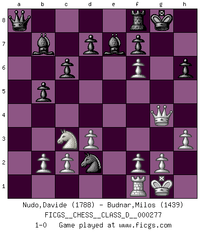 Last move : 1-0 2021 June 3 7:16:54 [Event "FICGS__CHESS__CLASS_D__000277"] [Site "FICGS"] [Date "2021.05.05"] [Round "1"] [White "Nudo,Davide"] [Black "Budnar,Milos"] [Result "1-0"] [WhiteElo "1788"] [BlackElo "1439"] 1.e4 e5 2.Nf3 Nc6 3.Bb5 a6 4.Ba4 b5 5.Bb3 Nf6 6.O-O Bb7 7.d3 Be7 8.Nc3 O-O 9.Bd2 h6 10.h3 Nd4 11.Nxe5 Ne6 12.a4 c6 13.axb5 axb5 14.Rxa8 Qxa8 15.Ng4 Nd4 16.e5 Nxb3 17.exf6 Nxd2 18.Nxh6+ gxh6 19.Qg4+ 1-0 Ruy Lopez : Caro variation Kingside Castling by player White (move 6) Kingside Castling by player Black (move 8) Player White won this chess game. Follow this game move after move (download)All Chess players should have a hobby. (Savielly Tartakower) Wenn sie aufgeben, dann danke ich Ihnen für das Spiel (Eventualzug beim Fernschach). (Anonymous) Diferente gente reacciona diferentemente en aceptar la derrota. (Bobby Fischer) Mais n'est-ce pas déjà le limiter injurieusement que d'appeler les échecs un jeu? N'est-ce pas aussi une science, un art, ou quelque chose qui, comme le cercueil de Mahomet entre ciel et terre, est suspendu entre l'un et l'autre, et qui réunit un nombre incroyable de contraires ? (Stefan Zweig) But they are useless. They can only give you answers. (Pablo Picasso, about computers)