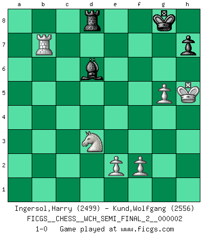 Last move : 1-0 2007 October 17 8:5:49 [Event "FICGS__CHESS__WCH_SEMI_FINAL_2__000002"] [Site "FICGS"] [Date "2007.07.11"] [Round "1"] [White "Ingersol,Harry"] [Black "Kund,Wolfgang"] [Result "1-0"] [WhiteElo "2499"] [BlackElo "2556"] 1.Nf3 Nf6 2.c4 b6 3.g3 c5 4.Bg2 Bb7 5.O-O g6 6.d4 cxd4 7.Qxd4 Bg7 8.Nc3 d6 9.Be3 Nbd7 10.Rac1 Nc5 11.b4 Ne6 12.Qd3 Ng4 13.Nd5 Nxe3 14.Qxe3 O-O 15.Bh3 Bc8 16.c5 bxc5 17.bxc5 dxc5 18.Rfd1 Qd6 19.Bxe6 Bxe6 20.Nf4 Qa6 21.Nxe6 fxe6 22.Rxc5 Qxa2 23.Rd7 Bf6 24.g4 Rfd8 25.Rdc7 Rd6 26.Kg2 Re8 27.Qe4 Rb6 28.g5 Bg7 29.Rc8 Rb8 30.R8c6 Rb2 31.Rxe6 Rb4 32.Qc6 Kf8 33.Re4 Qa3 34.Nd2 Rxe4 35.Nxe4 Qb2 36.Rc4 Qb8 37.h4 a6 38.Nc5 Qa8 39.Nb7 Be5 40.Qe4 Rc8 41.Rb4 Bc3 42.Rb6 Kg8 43.Qxe7 Rf8 44.Rc6 Rf7 45.Qd8+ Qxd8 46.Nxd8 Rd7 47.Ne6 Kf7 48.Rxa6 Be5 49.Kf3 Rd5 50.Nf4 Rd4 51.Nd3 Bb8 52.Rb6 Rd8 53.Rb7+ Kg8 54.Kg4 Bd6 55.h5 gxh5+ 56.Kxh5 1-0 Reti Opening Kingside Castling by player White (move 5) Kingside Castling by player Black (move 14) 10 pieces endgame at move 56 : White KRNPPP , Black KRBP WHITE : King + 1 Rook 1 Knight 3 Pawns BLACK : King + 1 Rook 1 Bishop 1 Pawn Player White won this chess game. Follow this game move after move (download)After black's reply to 1.e4 with 1..e5, leaves him always trying to get into the game. (Howard Staunton) Der beste Spieler in einem Turnier gewinnt es nie. Er landet auf Platz zwei oder drei. (Siegbert Tarrasch) La mitad de las variaciones que son calculadas en una partida de torneo, resultan ser completamente superfluas. Desafortunadamente, nadie sabe por adelantado cual mitad. (Jan Tinman) Les échecs, c'est l'art d'analyser. (Mikhail Botvinnik) As the days dwindle down... to a precious few. (Maxwell Anderson)