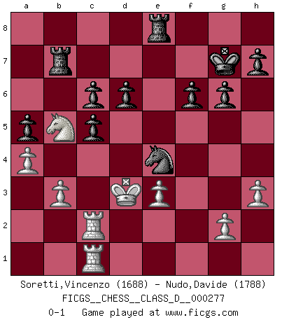 Last move : 0-1 2021 June 10 16:19:12 [Event "FICGS__CHESS__CLASS_D__000277"] [Site "FICGS"] [Date "2021.05.05"] [Round "1"] [White "Soretti,Vincenzo"] [Black "Nudo,Davide"] [Result "0-1"] [WhiteElo "1688"] [BlackElo "1788"] 1.e4 e5 2.Nf3 Nc6 3.Bb5 g6 4.c3 a6 5.Ba4 d6 6.d4 Bd7 7.Bc2 exd4 8.cxd4 Bg4 9.Be3 Bg7 10.Bb3 Bxf3 11.Qxf3 Qf6 12.Qxf6 Bxf6 13.Nc3 Bxd4 14.Bd5 Bxe3 15.Bxc6+ bxc6 16.fxe3 Nf6 17.Rd1 Ng4 18.Ke2 O-O 19.h3 Ne5 20.Rhf1 Kg7 21.b3 a5 22.Rf2 c5 23.Nb5 Rfc8 24.a4 Rab8 25.Ke1 Rb7 26.Rc2 Re8 27.Ke2 f6 28.Rcd2 Nf7 29.Kd3 Ng5 30.Rc1 Nxe4 31.Rdc2 c6 0-1 Ruy Lopez : Fianchetto (Smyslov/Barnes) defense Kingside Castling by player Black (move 18) Player Black won this chess game. Follow this game move after move (download)War is the child of passion, passion is the child of narcissism and narcissism is the child. (...) Another game ? (Thibault de Vassal) Ich war zu klein für die Schach-Schülermannschaft! (Woody Allen) El Ajedrez es el juego mas altamente simbólico, pero las agresiones estan por lo tanto aún mas francamente representadas en la partida. Tal vez comenzo como un juego de guerra; Algo como la representación de una batalla en miniatura entre las fuerzas de dos reinos. (Karl Meninger) La guerre est enfant de la passion, la passion est enfant du narcissisme et le narcissisme est l'enfant. (...) Une autre partie ? (Thibault de Vassal) There's no money in correspondence chess. (John Knudsen)