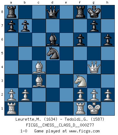 Last move : 1-0 2021 June 12 5:3:26 [Event "FICGS__CHESS__CLASS_D__000277"] [Site "FICGS"] [Date "2021.05.05"] [Round "1"] [White "Leurette,Marc-Antoine"] [Black "Tedoldi,Guido"] [Result "1-0"] [WhiteElo "1634"] [BlackElo "1587"] 1.e4 c5 2.d4 cxd4 3.c3 e5 4.cxd4 d6 5.dxe5 Nc6 6.exd6 Bxd6 7.Bb5 Nge7 8.Nf3 Bb4+ 9.Bd2 Bd6 10.O-O O-O 11.Nc3 h6 12.Nd5 Nxd5 13.exd5 Ne7 14.Bc3 Bg4 15.Qd4 f6 16.Qxg4 Nxd5 17.Bc4 1-0 Sicilian : Smith-Morra gambit Kingside Castling by player White (move 10) Kingside Castling by player Black (move 10) Player White won this chess game. Follow this game move after move (download)Chess is the gymnasium of the mind. (Blaise Pascal) Ich habe Kasparov in Rente geschickt. (Veselin Topalov) Uno no tiene que jugar muy bien, es suficiente jugar mejor que el oponente. (Siegbert Tarrasch) Psychologiquement, tu dois avoir confiance en toi même, mais cette confiance doit être basée sur des faits. (Robert Fischer) There is no instance of a country having benefited from prolonged warfare. (Sun Tzu)