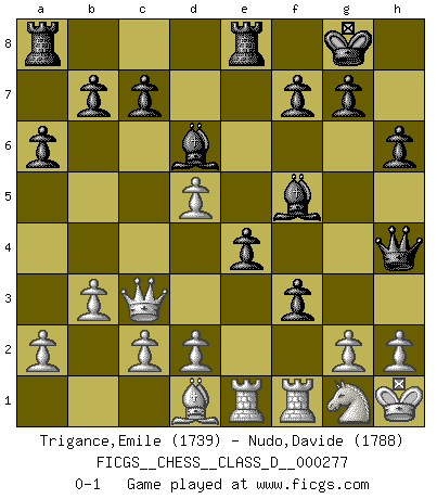 Last move : 0-1 2021 June 2 13:45:7 [Event "FICGS__CHESS__CLASS_D__000277"] [Site "FICGS"] [Date "2021.05.05"] [Round "1"] [White "Trigance,Emile"] [Black "Nudo,Davide"] [Result "0-1"] [WhiteElo "1739"] [BlackElo "1788"] 1.e4 e5 2.f4 exf4 3.Nf3 d6 4.Bc4 h6 5.b3 Nc6 6.Bb2 Nf6 7.Nc3 Be7 8.Qe2 O-O 9.O-O Bg4 10.Nd5 Nxd5 11.exd5 Ne5 12.Bxe5 dxe5 13.Rae1 Bc5+ 14.Kh1 Re8 15.Qd3 Bd6 16.Bb5 Re7 17.Qc3 e4 18.Ng1 a6 19.Be2 Bf5 20.Bd1 Re8 21.Nh3 f3 22.Ng1 Qh4 0-1 KGA : Fischer defense Kingside Castling by player Black (move 8) Kingside Castling by player White (move 9) Player Black won this chess game. Follow this game move after move (download)Tactics flow from a superior position. (Bobby Fischer) Schach ist gnadenlos. Du mußt bereit sein zu töten. (Nigel Short) La captura del Rey enemigo es la finalidad pero no el primer objetivo de la partida. (William Steinitz) Dans le domaine de la peinture, de la gravure et de la sculpture, dès la première décennie de notre siècle, les artistes abandonnent la représentation de la partie d'échecs pour se concentrer sur les pièces, sur les échiquiers et sur toutes les variations auxquelles les unes et les autres peuvent donner lieu. On passe en quelque sorte d'un thème social à un thème musical (au sens de la musica médiévale, c'est-à-dire d'une notion qui inclue le rythme, l'harmonie, la construction et la déconstruction, etc.). Graphiquement et picturalement, l'échiquier apparaît comme une structure ouverte, dynamique, d'une richesse infinie, autorisant toutes les combinatoires et débouchant sur des mouvements et des rythmes de nature exponentielle. (Michel Pastoureau) The mind is like a parachute, it only functions when its open. (Unknown)