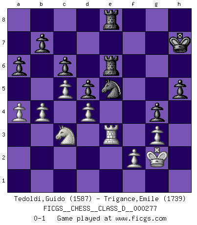 Last move : 0-1 2021 August 20 3:45:41 [Event "FICGS__CHESS__CLASS_D__000277"] [Site "FICGS"] [Date "2021.05.05"] [Round "1"] [White "Tedoldi,Guido"] [Black "Trigance,Emile"] [Result "0-1"] [WhiteElo "1587"] [BlackElo "1739"] 1.c4 e5 2.Nc3 Nc6 3.Nf3 f5 4.d3 d6 5.e3 Nf6 6.Be2 Be7 7.O-O h6 8.h3 O-O 9.a3 a6 10.b4 Be6 11.Bb2 g5 12.Nh2 Qd7 13.d4 exd4 14.exd4 d5 15.Bf3 Bf7 16.c5 Rad8 17.Re1 Kh8 18.Bc1 Kh7 19.Bb2 Rg8 20.Rc1 g4 21.hxg4 Nxg4 22.Nxg4 fxg4 23.Be2 h5 24.Bd3+ Kh8 25.Qd2 Bg5 26.Qc2 Bxc1 27.Qxc1 Bg6 28.Qh6+ Qh7 29.Qxh7+ Bxh7 30.Rd1 Bxd3 31.Rxd3 Rge8 32.Kf1 Re6 33.Bc1 Rde8 34.Be3 Ne7 35.g3 c6 36.Kg2 Nf5 37.Bf4 Kh7 38.Be5 Ne7 39.a4 Ng6 40.Re3 Nxe5 0-1 English : Three knights system Kingside Castling by player White (move 7) Kingside Castling by player Black (move 8) Player Black won this chess game. Follow this game move after move (download)Chess is in its essence a game, in its form an art, and in its execution a science. (Baron Tassilo) Bogoljubow: Matt in vier Zügen! Tartakower: Ich verbitte mir jede Belästigung! (Savielly Grigorievitsch Tartakower) El Ajedrez es tortura mental. (Garry Kasparov) 'L'échange des dames est un coup dur pour les deux adversaires...' Un journaliste lors d'une partie du match Spassky-Fischer It's not the size of the dog in the fight, it's the size of the fight in the dog. (Mark Twain)