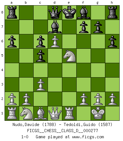 Last move : 1-0 2021 June 2 8:32:30 [Event "FICGS__CHESS__CLASS_D__000277"] [Site "FICGS"] [Date "2021.05.05"] [Round "1"] [White "Nudo,Davide"] [Black "Tedoldi,Guido"] [Result "1-0"] [WhiteElo "1788"] [BlackElo "1587"] 1.e4 c5 2.Nf3 Nc6 3.Bb5 d6 4.O-O Bd7 5.Re1 e5 6.c3 Nf6 7.d4 a6 8.Bxc6 bxc6 9.dxe5 Ng4 10.exd6 h6 11.e5 Nxe5 12.Nxe5 1-0 Sicilian : Nimzovich-Rossolimo attack (without ...d6) Kingside Castling by player White (move 4) Player White won this chess game. Follow this game move after move (download)If your opponent offers you a draw, try to work out why he thinks he's worse off. (Nigel Short) Das Zentrum ist der Balkan des Schachbretts - Kriegshandlungen können in jedem Moment ausbrechen. (Aaron Nimzowitsch) El Ajedrez es un expediente tonto que hace creer a la gente inactiva que hacen una cosa muy astuta cuando solamente estan perdiendo su tiempo. (George Bernard Shaw) On entre au jeu d'Echecs comme on entre en Religion. Pour le joueur d'Echecs, la partie d'Echecs c'est l'office, la messe, le défilé du 1er Mai, le dépôt de gerbe au Monument aux Morts. C'est un drame sacré. (Michel Roos) To err is human, but to really foul things up requires a computer. (Farmer's Almanac, 1978)