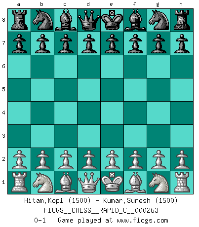Last move : 0-1 2021 June 12 6:24:14 [Event "FICGS__CHESS__RAPID_C__000263"] [Site "FICGS"] [Date "2021.05.13"] [Round "1"] [White "Hitam,Kopi"] [Black "Kumar,Suresh"] [Result "0-1"] [WhiteElo "1500"] [BlackElo "1500"] 0-1 This chess game has been lost on time (started : 2021.05.13 1:22:51) Player Black won this chess game. Follow this game move after move (download)I had a toothache during the first game. In the second game I had a headache. In the third game it was an attack of rheumatism. In the fourth game, I wasn't feeling well. And in the fifth game? Well, must one have to win every game ? (Siegbert Tarrasch) Du weisst es gibt ein Problem mit Computern und Fernschach, wenn jeder eine Rating von 2450 hat. (John Christen Knudsen) El Ajedrez no es como la vida... ¡tiene reglas!. (Mark Pasternak) Si le désir cupide (et stupide) de gagner est une inépuisable source de souffrance, une combinaison brillante sur l'échiquier est une découverte : le coquelicot qui s'épanouit lorsque apparaît la Voie Lactée. (Arrabal) The project of the man are lower than those of the sky. (Chinese proverb)