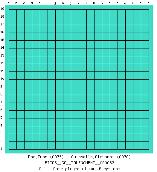 Last move : 0-1 2021 June 12 6:24:14 [Event "FICGS__GO__TOURNAMENT__000083"] [Site "FICGS"] [Date "2021.05.13"] [Round "1"] [Black "Dao,Tuan"] [White "Autobello,Giovanni"] [Result "0-1"] [Rating 1 "0079"] [Rating 2 "0070"] 0-1 This go game has been lost on time (started : 2021.05.13 1:24:5) Here are the names of the openings (joseki) played in the four corners : Player White won this Go (weiqi, baduk) game. Follow this game move after move (download)If White takes all four corners, Black should resign; if Black takes all four corners, Black should also resign. (David Kent) Difficult things take a long time, impossible things a little longer. (Author unknown)