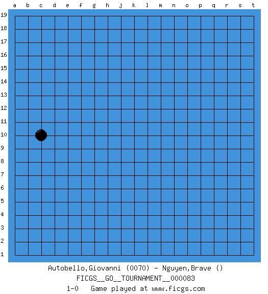 Last move : 1-0 2021 June 13 9:58:43 [Event "FICGS__GO__TOURNAMENT__000083"] [Site "FICGS"] [Date "2021.05.13"] [Round "1"] [Black "Autobello,Giovanni"] [White "Nguyen,Brave"] [Result "1-0"] [Rating 1 "0070"] 1.c10 1-0 This go game has been lost on time (started : 2021.05.13 1:24:5) Here are the names of the openings (joseki) played in the four corners : Player Black won this Go (weiqi, baduk) game. Follow this game move after move (download)Keep inessential ataris till the end. (Anonymous) Being number two sucks. (Andre Agassi)