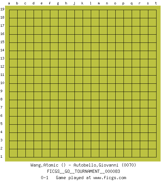 Last move : 0-1 2021 June 12 6:24:14 [Event "FICGS__GO__TOURNAMENT__000083"] [Site "FICGS"] [Date "2021.05.13"] [Round "1"] [Black "Wang,Atomic"] [White "Autobello,Giovanni"] [Result "0-1"] [Rating 2 "0070"] 0-1 This go game has been lost on time (started : 2021.05.13 1:24:5) Here are the names of the openings (joseki) played in the four corners : Player White won this Go (weiqi, baduk) game. Follow this game move after move (download)There is no territory in the centre. (Anonymous) We cannot be sure of having something to live for unless we are willing to die for it. (Ernesto Che Guevara)