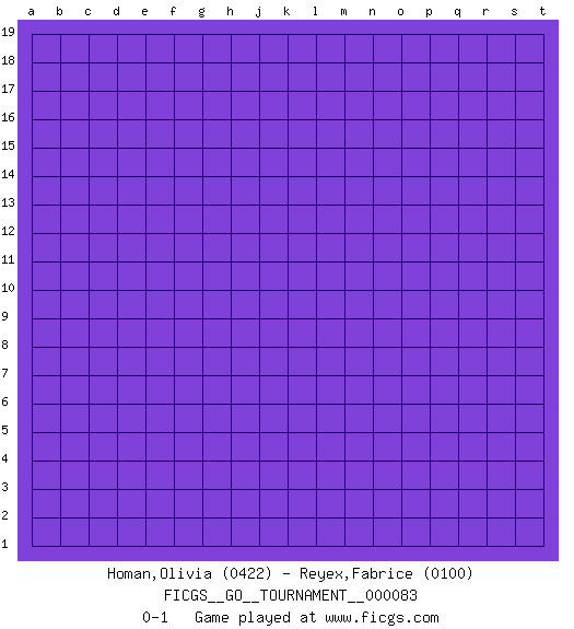 Last move : 0-1 2021 June 12 6:24:14 [Event "FICGS__GO__TOURNAMENT__000083"] [Site "FICGS"] [Date "2021.05.13"] [Round "1"] [Black "Homan,Olivia"] [White "Reyex,Fabrice"] [Result "0-1"] [Rating 1 "0422"] [Rating 2 "0100"] 0-1 This go game has been lost on time (started : 2021.05.13 1:24:5) Here are the names of the openings (joseki) played in the four corners : Player White won this Go (weiqi, baduk) game. Follow this game move after move (download)Good moves and bad moves are bedfellows. (Anonymous) SEO proverb : Make your website optimized for human beings, not for search engines.
