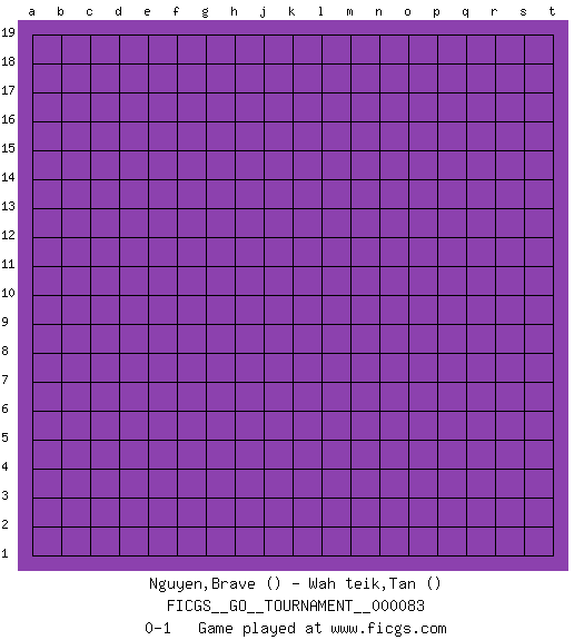 Last move : 0-1 2021 June 12 6:24:14 [Event "FICGS__GO__TOURNAMENT__000083"] [Site "FICGS"] [Date "2021.05.13"] [Round "1"] [Black "Nguyen,Brave"] [White "Wah teik,Tan"] [Result "0-1"] 0-1 This go game has been lost on time (started : 2021.05.13 1:24:5) Here are the names of the openings (joseki) played in the four corners : Player White won this Go (weiqi, baduk) game. Follow this game move after move (download)Pon-nuki is worth thirty points. (Anonymous) A good aphorism is too hard for the tooth of time, and is not worn away with the centuries, although it serves as food for every speech. (Friedrich Nietzsche)