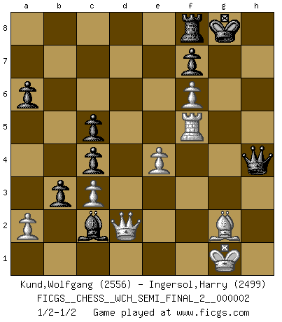 Last move : 1/2-1/2 2007 September 17 16:7:2 [Event "FICGS__CHESS__WCH_SEMI_FINAL_2__000002"] [Site "FICGS"] [Date "2007.07.11"] [Round "6"] [White "Kund,Wolfgang"] [Black "Ingersol,Harry"] [Result "1/2-1/2"] [WhiteElo "2556"] [BlackElo "2499"] 1.Nf3 d5 2.d4 Nf6 3.c4 e6 4.g3 dxc4 5.Bg2 a6 6.O-O Nc6 7.e3 Bd7 8.Qe2 b5 9.Nc3 Bd6 10.e4 e5 11.dxe5 Nxe5 12.Nxe5 Bxe5 13.f4 Bxc3 14.bxc3 c6 15.Be3 O-O 16.Bc5 Re8 17.f5 Qc7 18.Rad1 Rad8 19.Qe3 Ng4 20.Qg5 Nf6 21.Bd4 h6 22.Qh4 Nh7 23.f6 c5 24.Be3 Bc6 25.Bxh6 Rxd1 26.Rxd1 Qe5 27.Bxg7 b4 28.Qg4 Qg5 29.Qf3 Ba4 30.Rb1 Bc2 31.Rf1 b3 32.h4 Qg6 33.Qf2 Nf8 34.Bxf8 Rxf8 35.Qd2 Qxg3 36.Rf5 Qxh4 1/2-1/2 Reti Opening Kingside Castling by player White (move 6) Kingside Castling by player Black (move 15) This chess game ended in a draw. Follow this game move after move (download)When you don't know what to do, wait for your opponent to get an idea - it's sure to be wrong. (Tarrasch) Rauchen ist dem Schachspieler bei seiner Arbeit, also im Wettkampf, untersagt. (Viktor Kortschnoi) El Ajedrez es imaginación. (David Bronstein) Un millionnaire : 'Monsieur Steinitz ! Vous ne participez aux tournois que pour l'argent, alors que moi je n'y viens que pour l'honneur.' Steinitz : 'Chacun joue pour ce qu'il n'a pas'... Everything in life is luck. (Donald Trump)