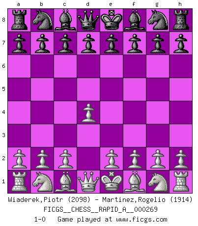 Last move : 1-0 2021 June 12 19:25:14 [Event "FICGS__CHESS__RAPID_A__000269"] [Site "FICGS"] [Date "2021.05.13"] [Round "1"] [White "Wiaderek,Piotr"] [Black "Martinez,Rogelio"] [Result "1-0"] [WhiteElo "2098"] [BlackElo "1914"] 1.d4 1-0 This chess game has been lost on time (started : 2021.05.13 8:33:11) Queen's pawn Player White won this chess game. Follow this game move after move (download)Chess is ruthless: you've got to be prepared to kill people. (Nigel Short) Kein Schachspieler kann gut schlafen. (H. G. Wells) El Ajedrez es en su esencia, un juego. En su forma, un arte. Y en su ejecución, una ciencia. (Baron Tassilo) Les échecs sont un jeu terrible. Si vous n'avez pas le centre, votre adversaire a une position plus libre. Par contre, si vous avez le centre, alors vous avez vraiment quelque chose pour laquelle vous inquiéter ! (Siegbert Tarrasch) The problem with manipulation is that people can turn on you. (Horatio Caine, C.S.I. Miami)